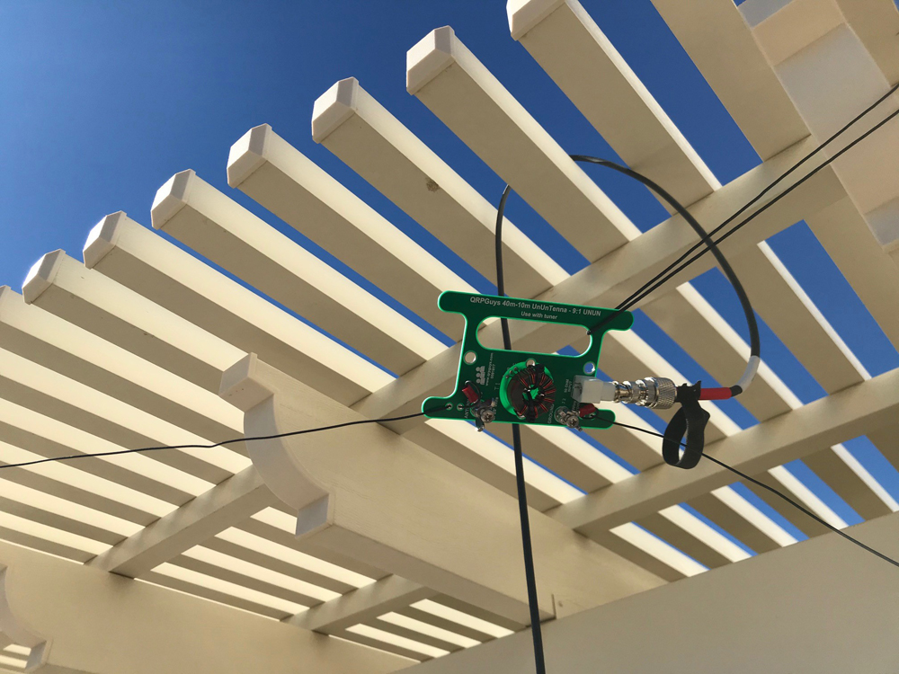 A closer view of the end fed antenna. The transformer is wound on a ferrite core and provides transformation of a high impedance end fed antenna to a closer match to 50-ohm coax. This antenna does require a tuner which is built into the KX2.