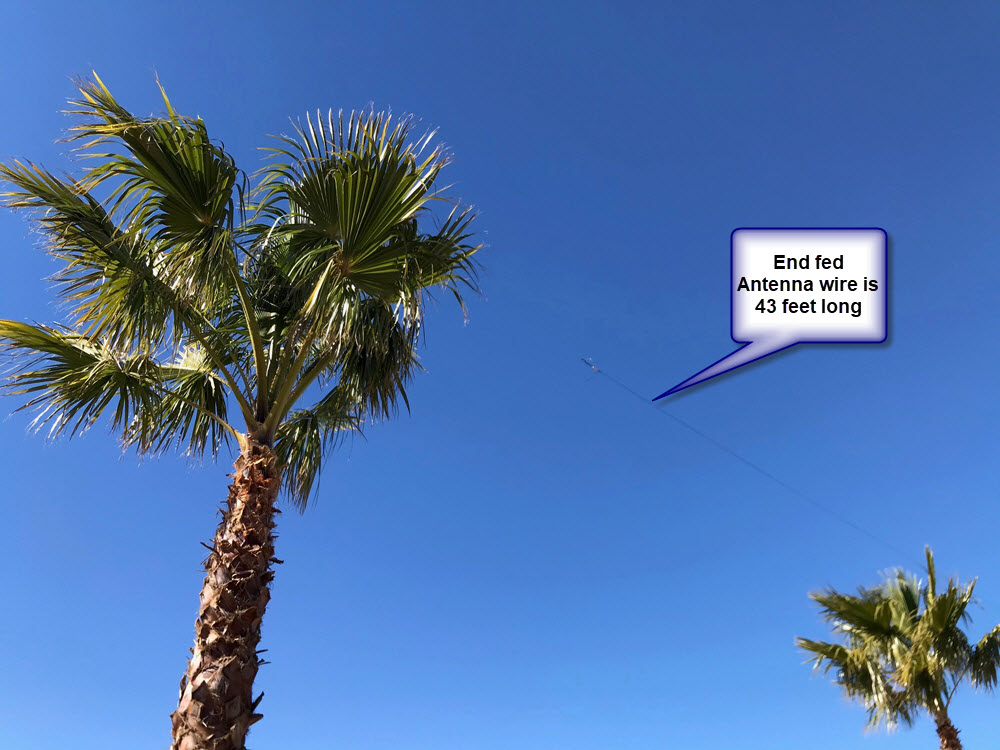 As installed, you can see the end fed wire heading off to the palm tree on the left, the coax dropping to the operating position, and the counterpoise wire heading off on the right.