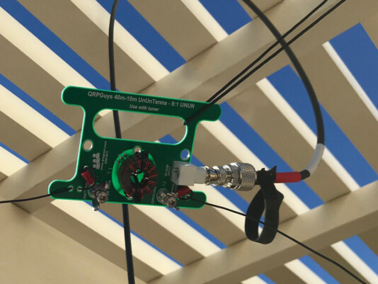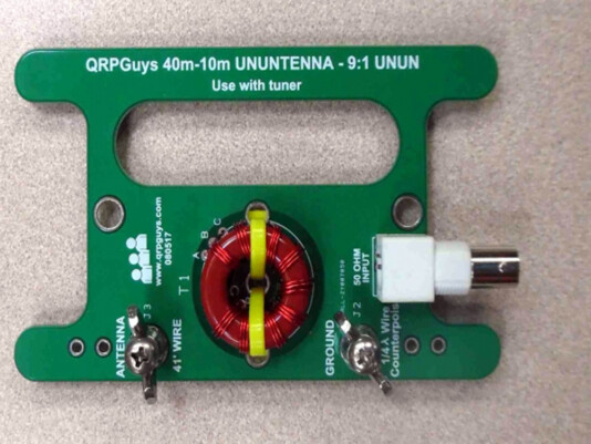 The other end of the antenna connects to the QRP Guys 10-40 meter 9:1 UNUN. This was a kit that included everything but the antenna wire. There were only a few parts, but it did require that you wind the transformer and solder it to the board. All in it took about one hour to assemble. The lead on the left is the end fed wire and the lead on the right is the counterpoise.